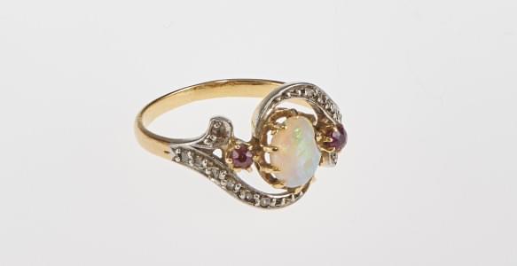 3101. Bague sertie d'une opale ovale épaulée de deux rubis et entourée...