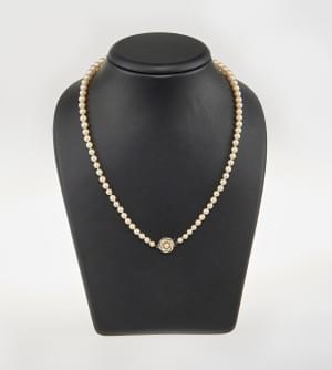 3105. Collier de perles en chute terminé par un fermoir serti d'une pe...