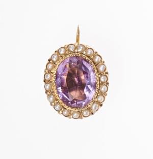 3108. Broche ovale sertie d'une améthyste entourée de perles