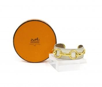 3113. Hermès, bracelet en cuir blanc garni de maillons dorés