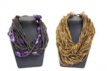 3132. Lot de deux colliers mullti-rangs d'améthystes et de coquillages