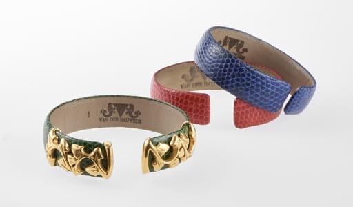 3150. Van der Bauwede, lot de trois bracelets en cuir vert, bleu et ro...