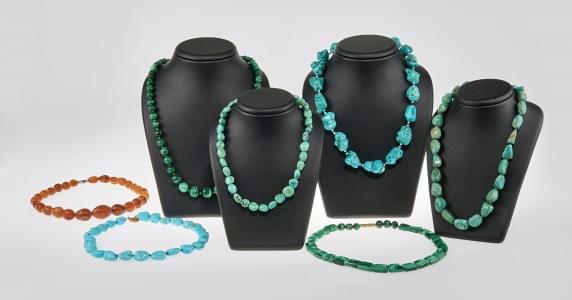 3155. Lot de sept colliers de pierres dures dont cornaline, turquoise...