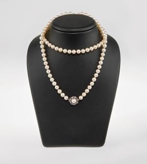 3159. Sautoir de perles terminé par un fermoir serti d'une perle entou...