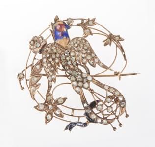 3166. Broche oiseau émaillée sertie de roses de diamant