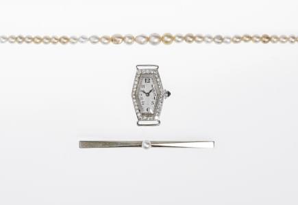 Or gris 750 et 585, L 6 cm, poids brut 12 g. On joint un collier...