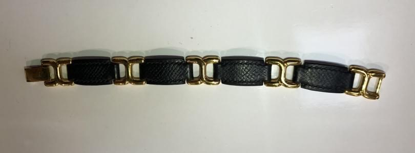 3111. Hermès, bracelet en cuir noir alterné de maillons dorés