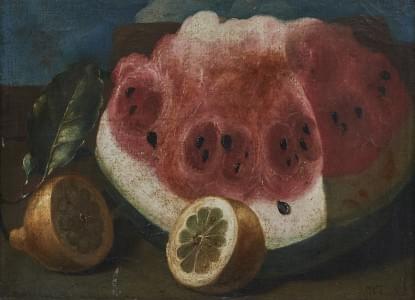 Nature morte à la pastèque et aux citrons, huile sur toile, 27x3...