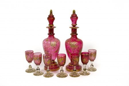 3369. Deux flacons et six petits verres, Bohème