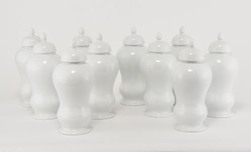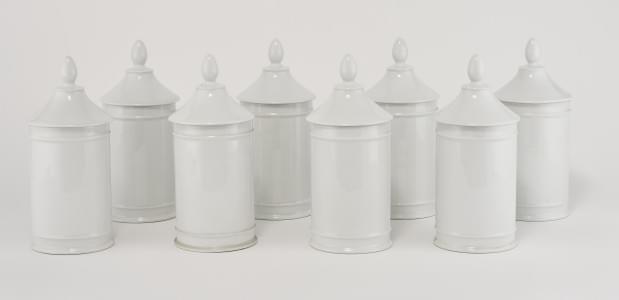 3392. Suite de 8 pots couverts cylindriques à prise ovoïde