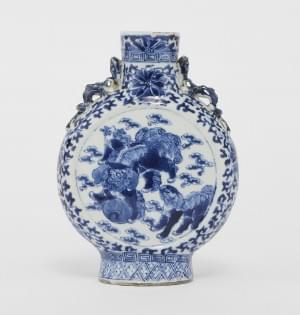 Porcelaine émaillée bleu blanc à décor de vases et scènes animée...