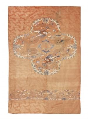 Soie à décor de dragons dans un motif quadrilobé sur fond rose,...