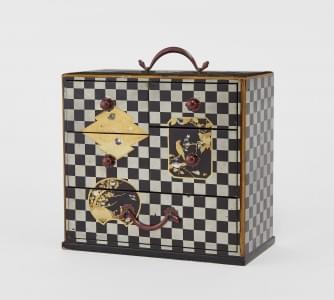 Laque noire, argent et or à motifs de damiers et de scènes en ré...