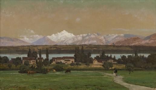 Vue du Mont-Blanc depuis les Pâquis, huile sur toile, signée, 40...