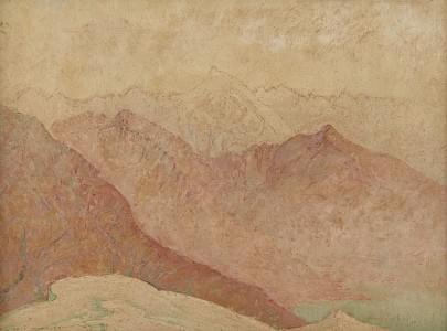 Vue de montagnes au coucher du soleil, huile sur carton, signée,...