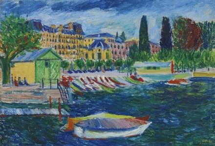 Port d'Ouchy, huile sur panneau, signée et datée 1951, 32x54 cm....