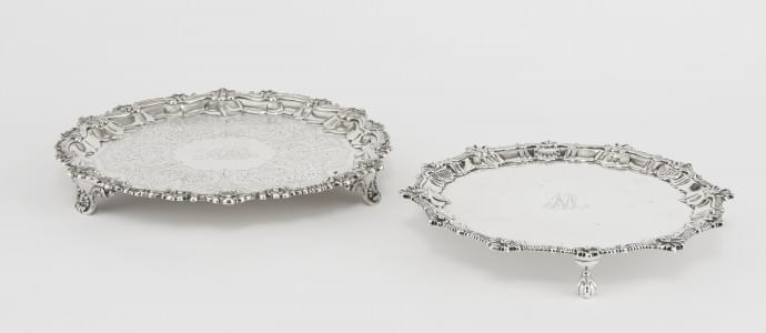 343. Deux plateaux tripodes d'époque George III à décor de fleurs