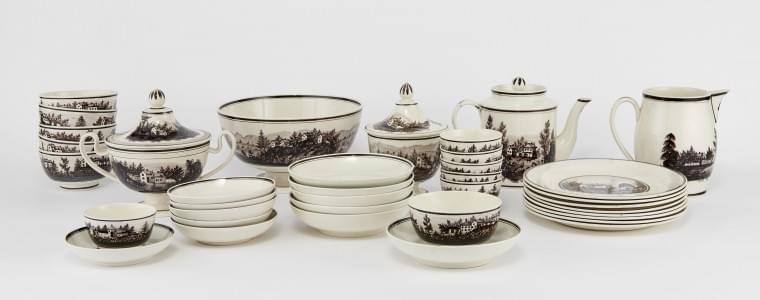Carouge, circa 1820, faïence, comprenant: soupière, sucrier, vas...