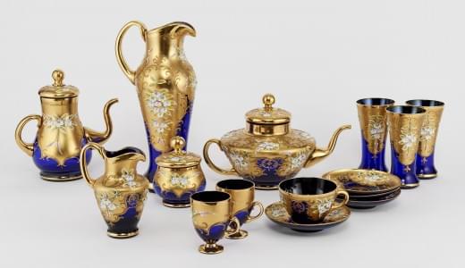 Iran, verre bleu émaillé et doré, comprenant théière, cafetière,...