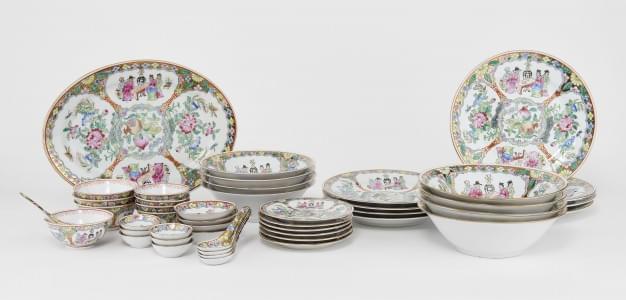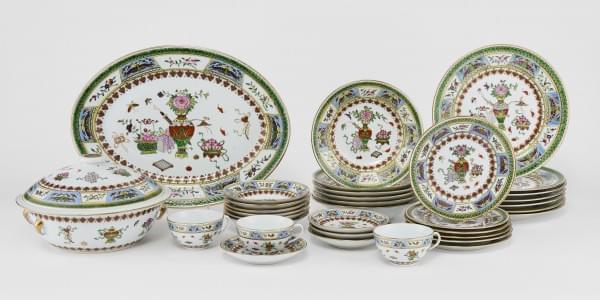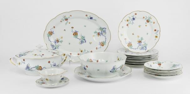 Porcelaine, comprenant: 20 assiettes à dîner, 15 à entremets, 12...