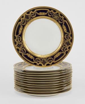 396. Suite de 12 assiettes à bordure dorée sur fond bleu nuit