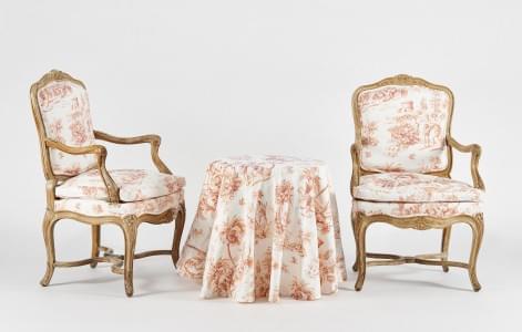 Bois patiné et toile de Jouy. On joint une table juponnée avec l...