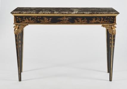 Bois laqué noir à décor au chinois, marbre veiné gris, 82x121x46...