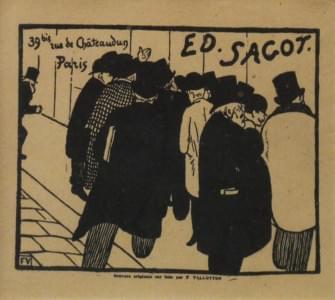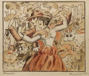 Dimanche (couple dansant), gravure sur bois rehaussée à l’aquare...