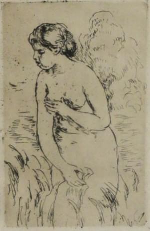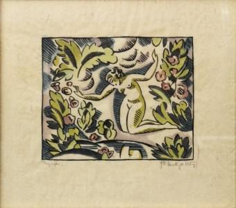 Nymphe, gravure sur bois rehaussée à l'aquarelle, titrée et sign...