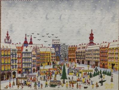 Marché de Noël, technique mixte sur pavatex, signé et daté 82, 4...
