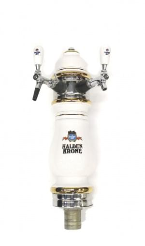 Deux robinets, métal et corps en porcelaine blanche, H 47 cm