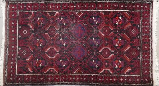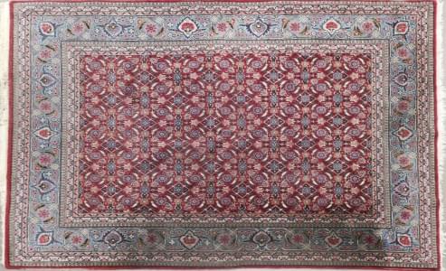 Laine à décor sur fond rouge, dans un cadre bleu, 209x144 cm