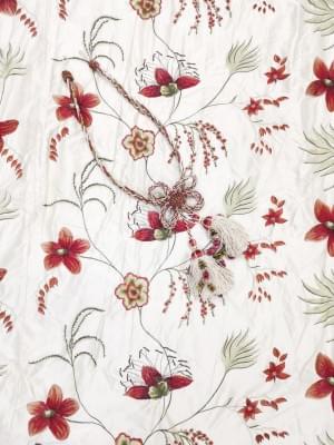Deux paires de rideaux de soie brodée de fleurs rouges et deux p...