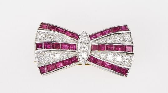 3281. Broche nœud sertie de lignes de rubis calibrés et de diamants