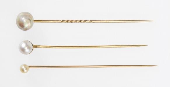 3228. Lot de deux épingles serties de demi-perles et de roses de diama...