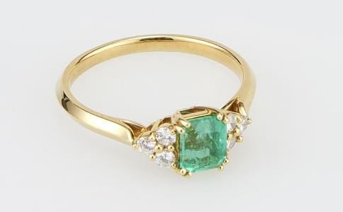 3289. Bague sertie d'une émeraude taille émeraude (env. 0,4 ct) épaulé...