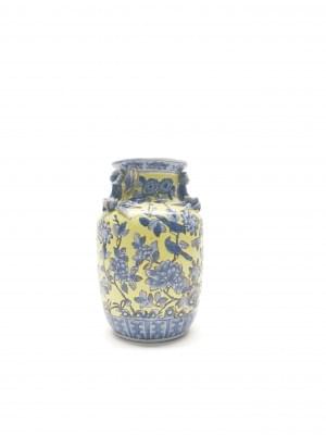 Porcelaine à décor de fleurs sur fond jaune, marque, H 19 cm. Pr...