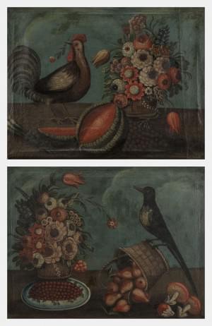 Bouquet de fleurs et coq sur un entablement, paire d'huiles sur...