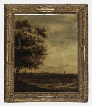 Paysage aux moulins, huile sur panneau, cadre en bois sculpté, 5...