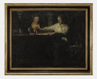 Peintre attablé avec sa femme, huile sur toile, monogrammée, 58x...