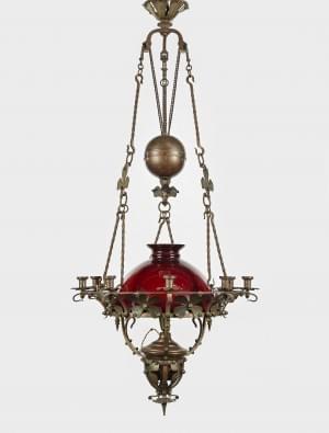 Bronze martelé, fer forgé et opaline rouge, H 163 et D 67 cm. Pr...