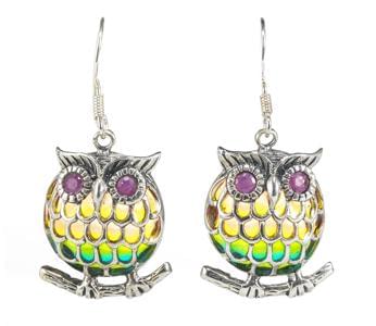 3006. *Pendants d'oreilles à motifs de hiboux émaillés et aux yeux ser...