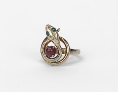 3009. Bague à motif de serpent retenant une cornaline et aux yeux sert...