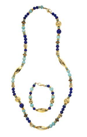 3048. Lot d'un collier et d'un bracelet sertis de perles de turquoise,...