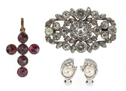 Un bracelet, deux broches et trois paires de clips d'oreilles, m...