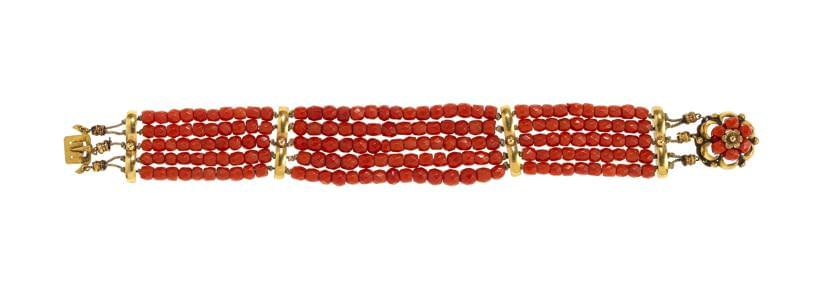 L'un composé de deux rangs de perles de corail facettées terminé...