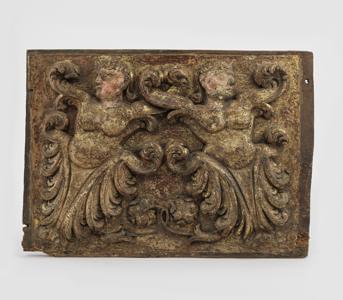 Bois sculpté en bas-relief, doré et polychrome, à motif de deux...
