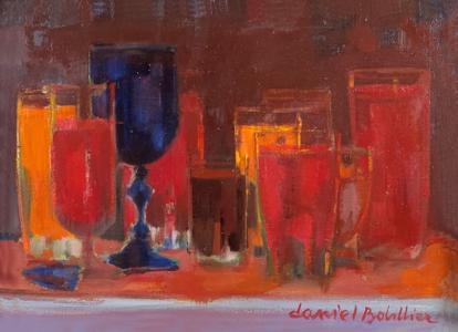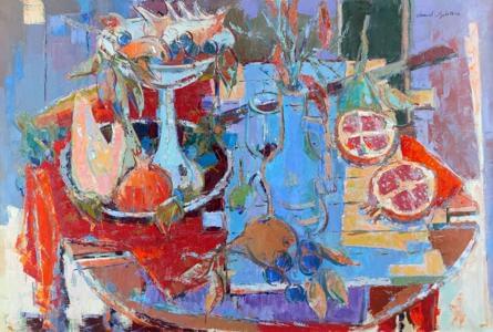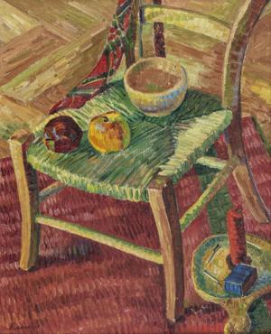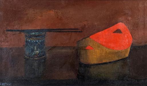 Nature morte aux pinceaux et à la corbeille rouge, huile sur toi...