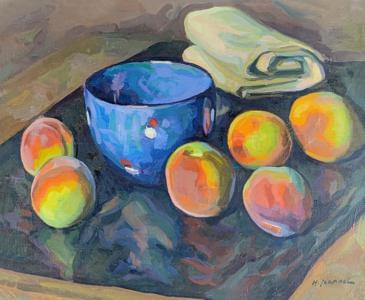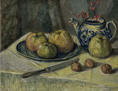 Nature morte aux pommes noix et à la théière, huile sur toile, s...