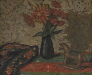Nature morte au cheval de bois, huile sur toile, signée et datée...